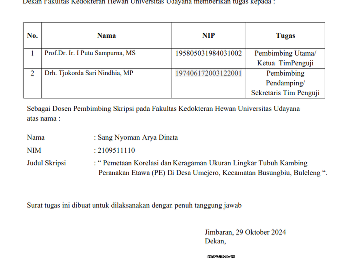 Bimbimbing Skipsi Sang Nyoman Arya Dinata Semester Genap 2024-2025 FKH UNUD